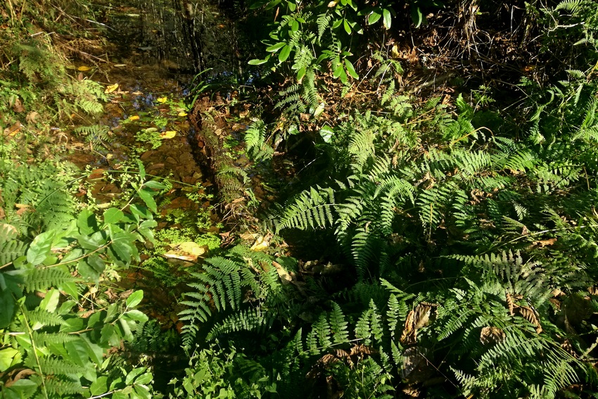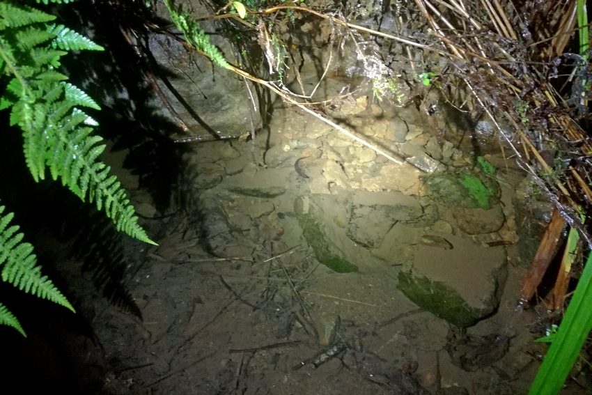 Aufenthaltsgewässer mehrerer Levante-Wasserfrösche im Charnali-Tal; ein halbschattiger Tümpel am Wegesrand.