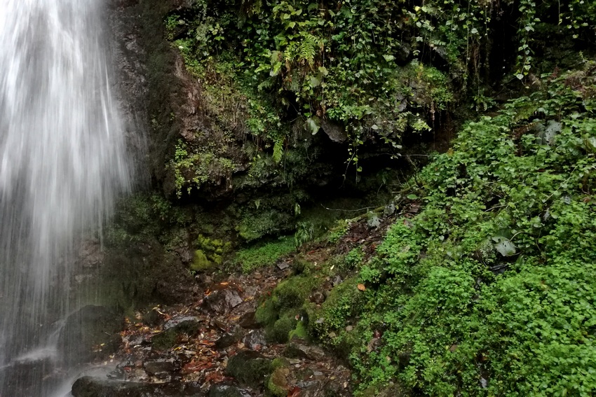 Habitat des Kaukasus-Salamanders direkt in der Spritzwasserzone des Wasserfalls: Die Tiere hielten sich unter Steinen und in Spalten entlang der Felskante auf.