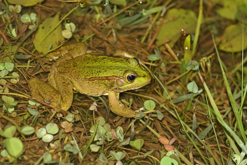 Sich sonnender Levante-Wasserfrosch (Pelophylax bedriagae); die Art war an allen Gewässern meist zahlreich vertreten.