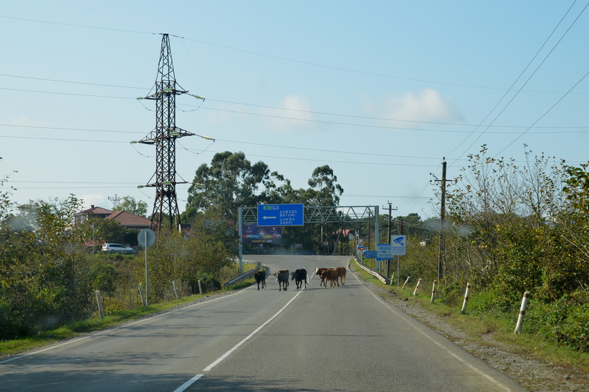 Eine typische Situation in Georgien - die hier neu ausgebaute Straße wird von Rindern blockiert, die allgegenwärtig sind und selbst die Straßenränder abweiden.