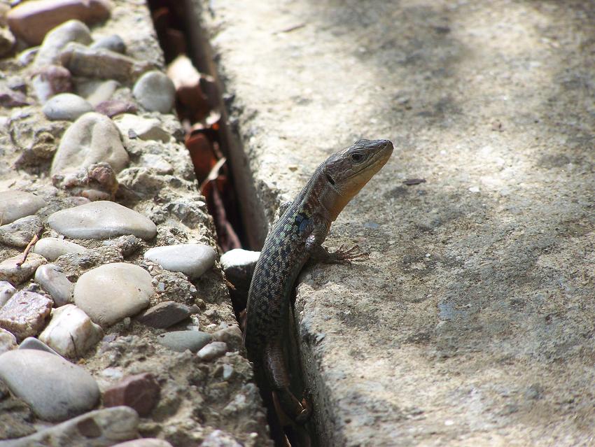 Das Männchen der Peloponneseidechse (Podarcis peloponnesiaca) besitzen auffällige blaue Flecken über dem Ansatz der Vorderbeine.