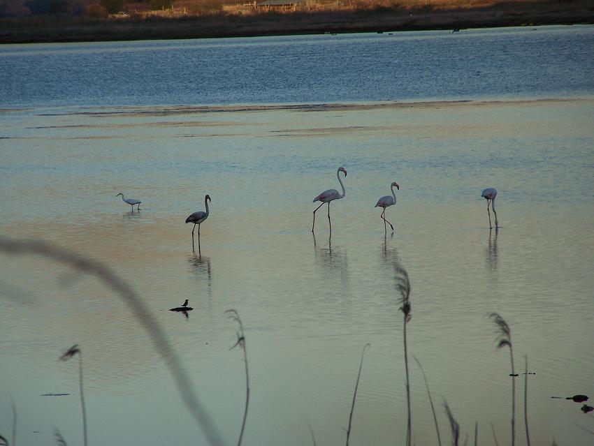 In der Lagune von Kalogria kann man Flamingos, Silberreiher und Eisvögel beobachten, hier sind sie alle auf einem Bild vereint.