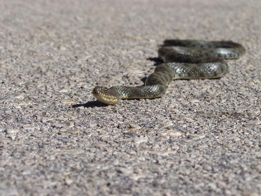 Die Würfelnatter (Natrix tessellata) sonnt sich gerne auf Asphaltstraßen und wird deshalb oft überfahren. In Deutschland existieren noch ganz wenige Restpopulationen an Nahe, Oder und Elbe in den letzten natürlich erhaltenen Flussdeltas.