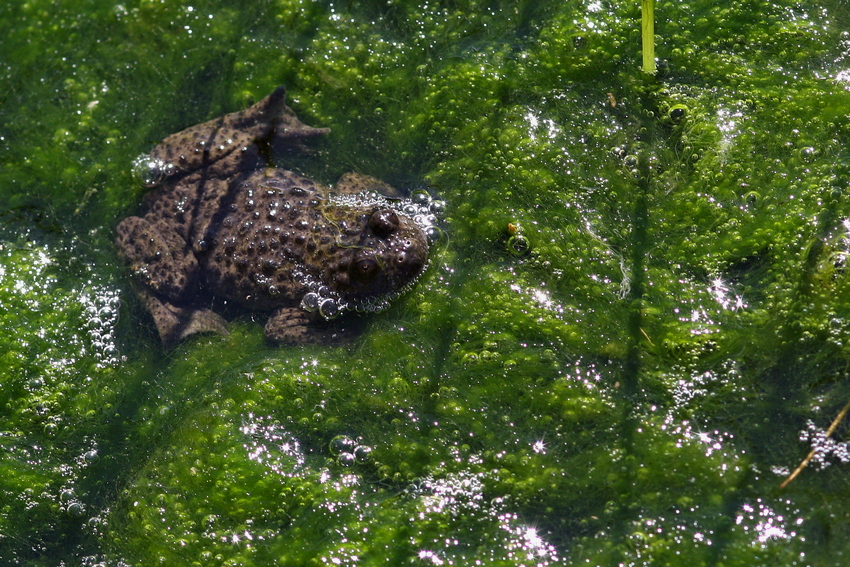 Gestärkt machten wir uns auf, eine Ruine, die wir am Straßenrand erspäht hatten, zu durchforschen. Die Entdeckungen einer weiteren Wechselkröte unter einem Brett und diverser Seefrösche in einem ehemaligen Pool erfreuten uns zwar, aber Bureschs Kammmolch (Triturus ivanbureschi) im Gewässer und vor allem dessen waghalsiger Fang weckte dann nochmals all unsere Aufmerksamkeit.