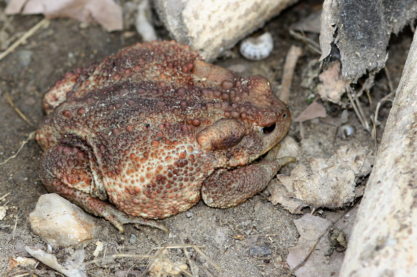 Ausgewachsenes Weibchen einer sehr warzigen Erdkröte (Bufo bufo).