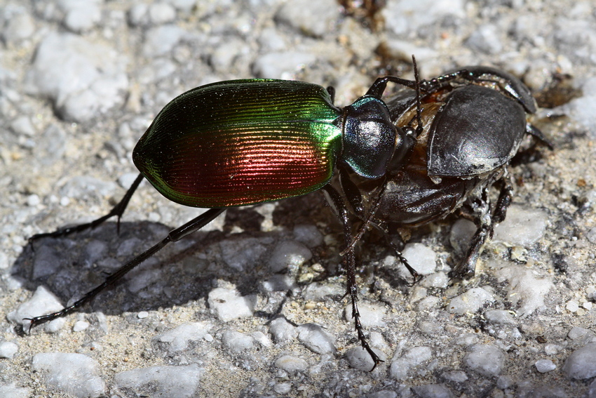Unser erster Fund - ein Puppenräuber (Calosoma sycophanta), der an einem frisch überfahrenen Blatthornkäfer auf dem Parkplatz einer Autobahnraststätte frisst.