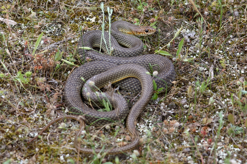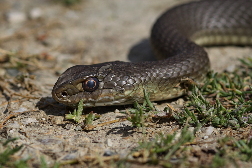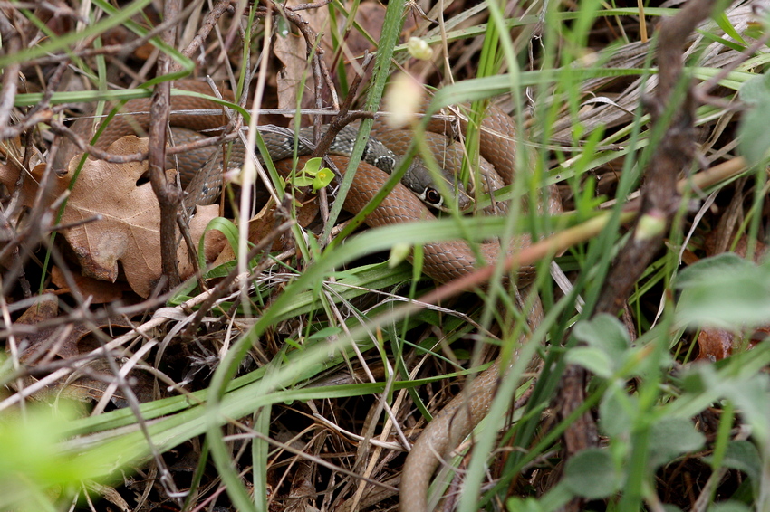 Schlanknatter (Platyceps najadum) sich sonnend versteckt im Gras, die schnelle und scheue Schlange fanden wir einige Male, konnten sie aber nur selten fotografieren.