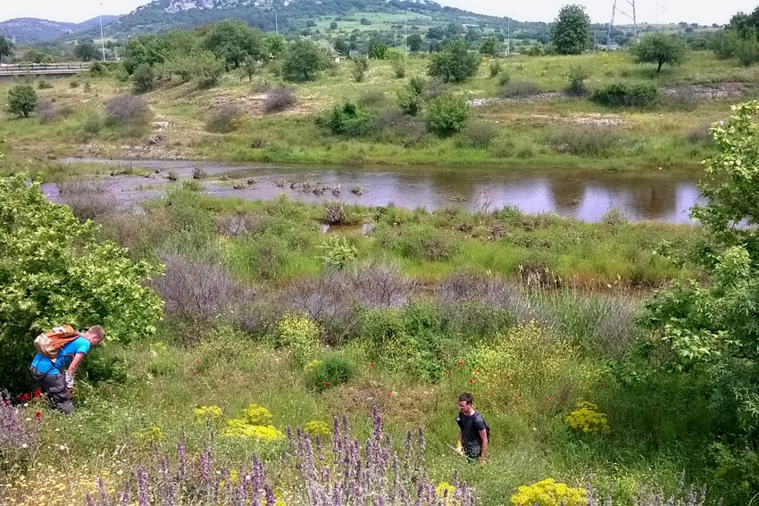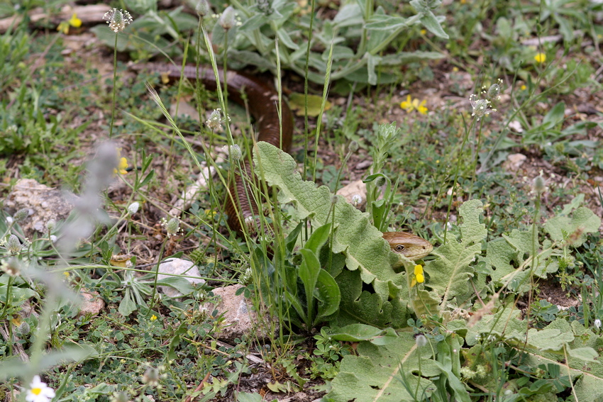 Einigermaßen ausgeschlafen und mit Wuhlas Frühstück gestärkt, machten wir uns auf den Weg zu unserem ersten hoffnungsvollen Bergotter-Spot: Die geschütteten Mauern am Evros, unweit von unserer Unterkunft entfernt. Unser erster Fund war allerdings unschön: Es handelte sich um ein offensichtlich absichtlich geköpftes Exemplar der Ringelnatter (Natrix natrix persa). In der Umgebung der Mauer entdeckten wir schnell ein Jungtier der Riesen-Smaragdeidechse (Lacerta trilineata) sowie unter Bauschutt eine weitere Wurmschlange. Zahlreiche Schildkröten waren unterwegs, darunter auch die Maurische Landschildkröte (Testudo graeca). An Gebüschsäumen huschte nicht nur die Riesen-Smaragdeidechse davon, sondern auch die Östliche Smaragdeidechse (Lacerta viridis) sowie der Scheltopusik, der uns mit seiner schlangenartigen Gestalt und seinem auffälligen Fluchtverhalten immer wieder aufschreckte und uns anschließend enttäuscht zurückließ. Die Bergotter blieb uns an diesem Morgen verborgen.