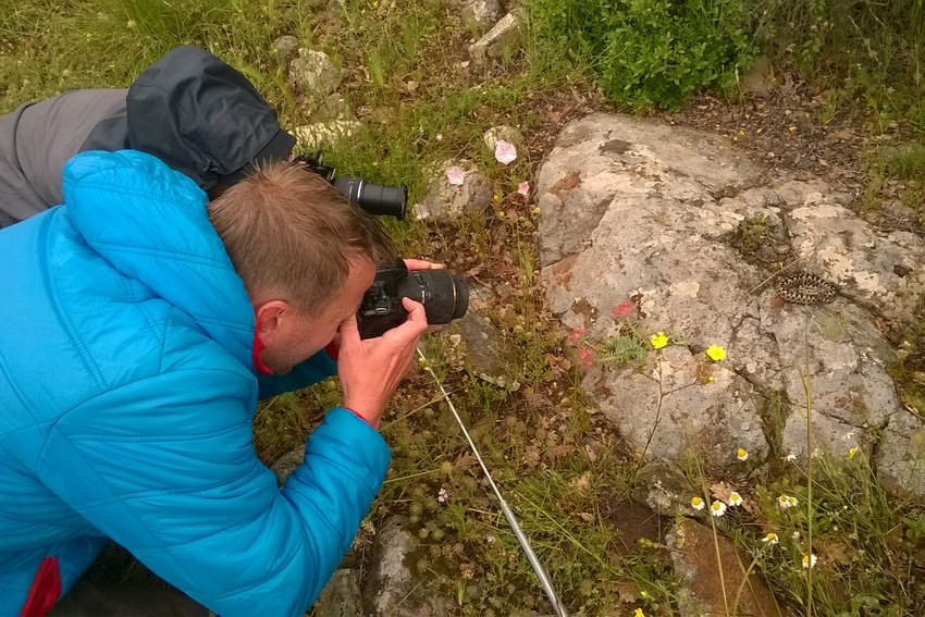 Der Morgen begann kühl und windig, die Sonne zeigte sich nur sporadisch. Trotzdem versuchten wir unser Glück entlang der Mauer. Bereits nach wenigen Metern fand Thomas eine große Haut, die wir (zurecht, wie sich später herausstellte) für die einer Bergotter hielten. Kurz darauf, einige Meter weiter, bewegte sich plötzlich etwas auf den Mauersteinen - es war unsere erste Bergotter. Die Begeisterung hielt allerdings nur wenige Sekunden an, denn so plötzlich wie sie vor unseren Augen erschienen war, war sie auch schon wieder in einer der unzähligen Mauerritzen verschwunden. Für ein Foto hatte der kurze Moment leider nicht ausgereicht. Mit neuer Motivation suchten wir weiter und fanden noch eine zweite von einer Bergotter stammende Haut sowie mehrere Ringelnattern. Zu unserer Enttäuschung tauchte die Bergotter allerdings nicht noch einmal auf. Das Wetter hatte sich mittlerweile weiter verschlechtert und es fing an zu nieseln. Trotzdem fuhren wir in die Berge östlich von Loutros, wo uns artenreiche, mit Steinen und Gebüschen durchsetzte Halbtrockenrasen erwarteten. Bei nass-kalter Witterung fand Ines zu unser aller Überraschung tatsächlich eine Hornotter (Vipera ammodytes), die sich außerhalb ihres Verstecks aufhielt. Nach ausgiebiger Fotosession ging es weiter entlang von gebüschreichen Trockenrasen und lichten Eichenwäldern. Doch der Regen verhinderte weitere Highlights und wir verbrachten den Mittag bei Kaffee und Frappé im LSD-Café in Loutros. Zum Abend hin klarte es nochmals etwas auf und wir versuchten unser Glück entlang der Ostseite der Ufermauer. Ein Jungtier der Kaspischen Pfeilnatter sowie einige Scheltopusiks waren aber unsere einzigen Funde. Bei Einbruch der Nacht suchten Thomas und Ines noch das Ufer des Evros auf. Hier fanden sie zahlreiche Westkaspische Schildkröten, die sich direkt im Verlandungsbereich des Flusses tummelten. Aufgrund des Nachweises der Bergotter am Morgen wollten wir unser Glück am Folgetag natürlich noch einmal versuchen und so verbrachten wir eine weitere Nacht in Loutros.