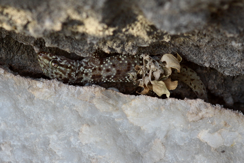 Der Europäische Halbfinger (Hemidactylus turcicus) versteckte sich unter einem Stein, auffällig sind die warzigen Tuberkel auf seiner Haut.