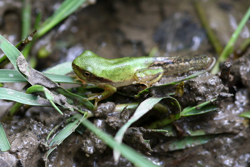 Frisch metamophosiertes Jungtier des Laubfroschs (Hyla arborea) am Rande eines Gewässers im Pinios-Delta.