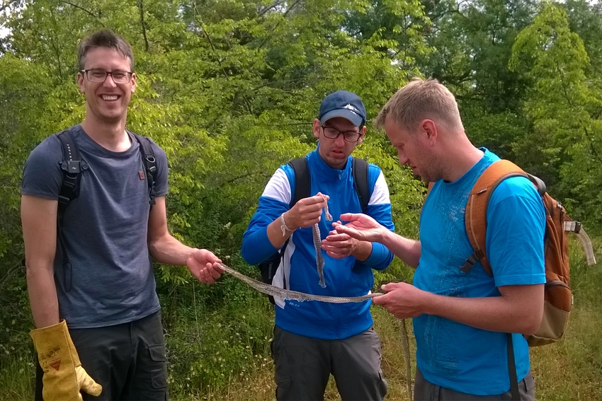 Wir machten uns am zeitigen Morgen auf in ein von Rindern beweidetes, busch- und strukturreiches Gebiet, das einige Arten versprach. Leider war das Wetter zuerst recht wechselhaft und kühl. Trotzdem fand Paul schnell eine große und recht aggressive Hornotter und kurz darauf eine ausgewachsene Kaspische Pfeilnatter. Thomas fand außerdem eine oberseits komplett schwarze, subadulte Ringelnatter. Auch sonst war das Gebiet mit seinen Kleingewässern artenreich. An Amphibien fanden wir die für uns neuen Arten Teichmolch (Lissotriton vulgaris), Springfrosch (Rana dalmatina) und Erdkröte (Bufo bufo) sowie Laubfrosch, Seefrosch und Wechselkröte. Beide Landschildkrötenarten waren ebenso vertreten wie die Taurische Eidechse (Podarcis tauricus), die Mauereidechse (Podarcis muralis) und die Östliche Smaragdeidechse. Etwas mulmig war uns allerdings bei der Begegnung mit der Rinderherde, die sowohl aus Mutterkühen mit Kälbern als auch aus einem etwa zwei Tonnen wiegenden Bullen bestand. Die Tiere verhielten sich neugierig, aber gleichzeitig scheu und schreckhaft. Wir versuchten ihnen möglichst aus dem Weg zu gehen, was uns letztlich auch gelang.