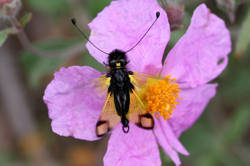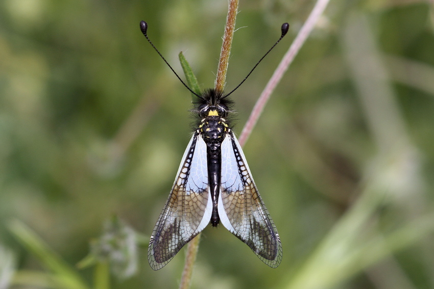 Sich im Regen aufwärmender Schmetterlingshaft (Libelloides macaronius) an einem Hang östlich von Loutros nahe der türkischen Grenze.