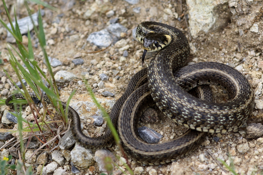 Diese Ringelnatter (Natrix natrix persa) zeigte ihr gesamtes Abwehrrepertoire vom Entleeren der Kloake über Scheinangriffe bis hin zum Totstellen.