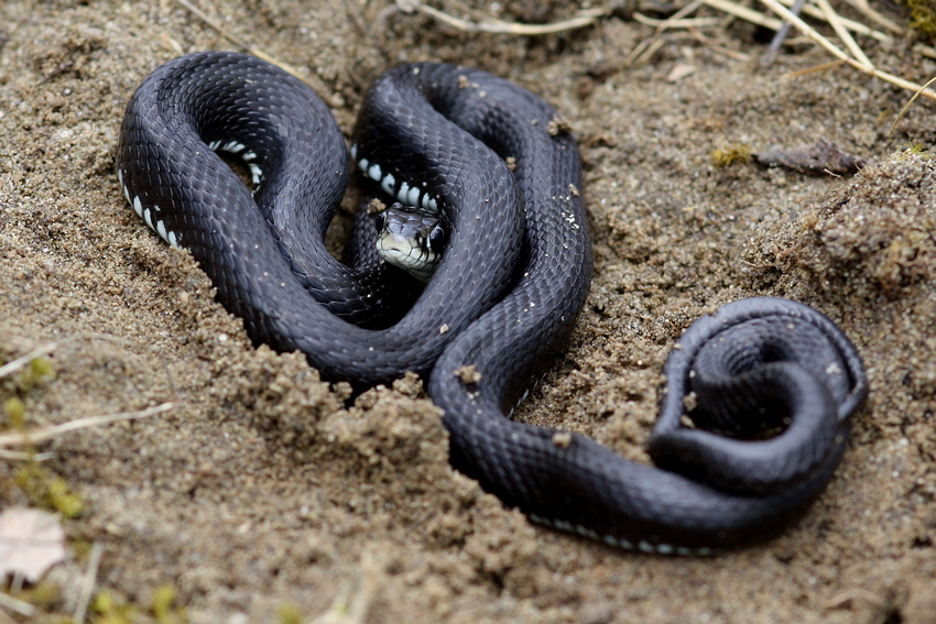 Oberseits komplett schwarz gefärbtes Exemplar der Ringelnatter aus dem Pinios-Delta.