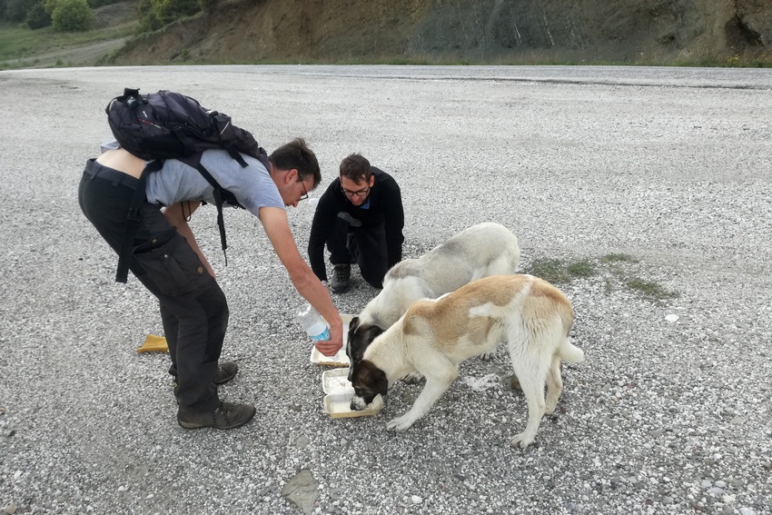Paul und André beim Tränken von Straßenhunden - nicht alle Hunde waren aggressiv und böse.