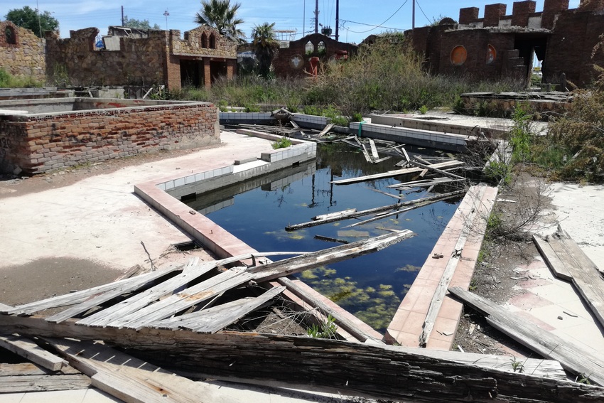 Verfallenes Clubgelände mit Pool - Habitat von Bureschs Kammmolch und Wechselkröte.