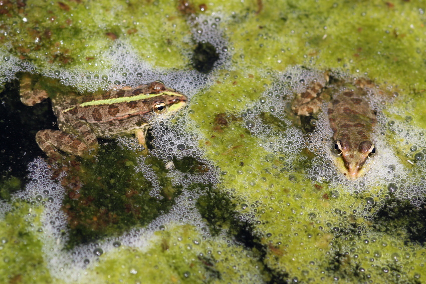 Zwei junge Seefrösche (Pelophylax ridibundus oder P. cf. bedriagae) in einer Viehtränke im bergigen Hinterland von Loutros.