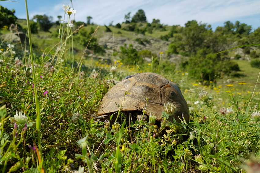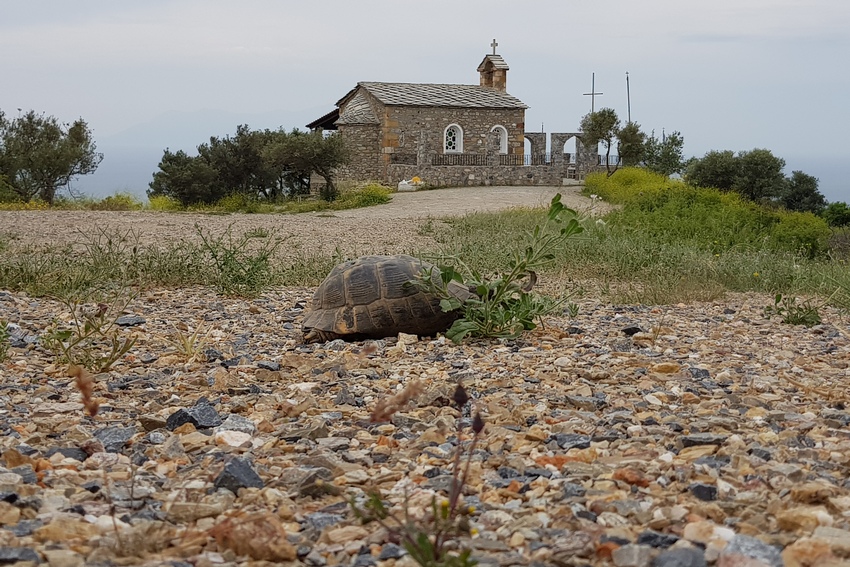 Natur und Kultur vereint - Maurische Landschildkröte auf einem Bergplateau bei Makri.