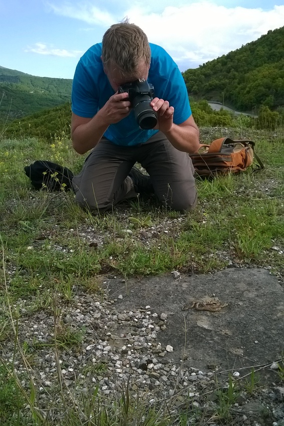Am frühen Morgen starteten wir unsere dreistündige Fahrt ins Pindos-Gebirge, um dort nach der Griechischen Wiesenotter zu suchen. Nach beschwerlichem Aufstieg über eine Geröllpiste erreichten wir um die Mittagszeit das etwa 1.800 m hoch liegende Plateau. Das Gelände war geprägt von magerer Vegetation mit einzelnen Büschen und Geröllhaufen - ein optimales Vipern-Biotop. Am Himmel kündigte leider eine dunkle Wolke Regen und Gewitter an, sodass wir unsere bis dahin erfolglose Suche nach zwei Stunden wieder abbrechen mussten. Einzige Funde auf dem Plateau waren Östliche Smaragdeidechse und Mauereidechse. Wir machten uns also auf den Rückweg und suchten verschiedene Stellen in den umgebenden Tälern auf, die geeignete Habitate versprachen. Auf den Straßen fanden wir zuerst ein überfahrenes Jungtier der Östlichen Eidechsennatter und danach eine überfahrene Kaspische Pfeilnatter. Der nächste Straßenfund war allerdings deutlich besser - Thomas entdeckte aus dem Augenwinkel eine juvenile und vor allem noch lebende Leopardnatter (Zamenis situla), die - offenbar frisch gehäutet - in traumhaften Farben erstrahlte. Dies rettete den bisher doch recht erfolglosen Tag, denn an anderen Stellen fanden wir nur die Griechische Blindschleiche (Anguis graeca), eine Erdkröte und den Gelben Skorpion (Mesobuthus gibbosus). Wir übernachteten im malerischen Bergdorf Metsovo, in dem zu gleicher Zeit ein nationaler Berglaufwettbewerb stattfand, weshalb das Örtchen überfüllt von Menschen war.
