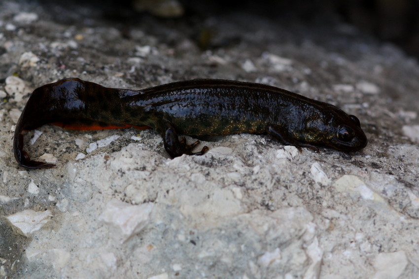 Am folgenden Morgen starteten Ines und Thomas einen weiteren Versuch, in den Höhen des Pindos-Gebirges die Griechische Wiesenotter zu finden, während André und Paul im Tal blieben, um dort in der Nähe von Gewässern zu suchen. An einer Viehtränke fanden wir auf dem Plateau einige Gelbbauchunken (Bombina variegata) und Bergmolche (Triturus alpestris), ansonsten war die etwas frustrierende Suche nach der Griechischen Wiesenotter in eigentlich optimal erscheinenden Habitaten leider erfolglos. Auf dem Abstieg fanden wir wenigstens noch die Prachtkieleidechse (Algyroides nigropunctatus). André und Paul hatten in der Ebene etwas mehr Glück und fanden neben Gelbbauchunken und Bergmolchen auch eine juvenile Äskulapnatter (Zamenis longissimus) sowie zahlreiche Prachtkieleidechsen und Taurische Eidechsen.
