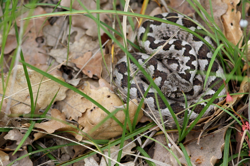 Weitere Hornotter im lichten Eichenwald östlich von Loutros, das Tier lag auf seine Tarnung vertrauend im Eichenlaub.