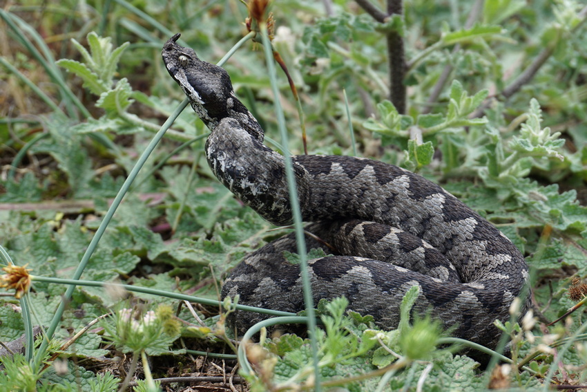 Recht aggressives, trächtiges Weibchen der Hornotter im Pinios-Delta.