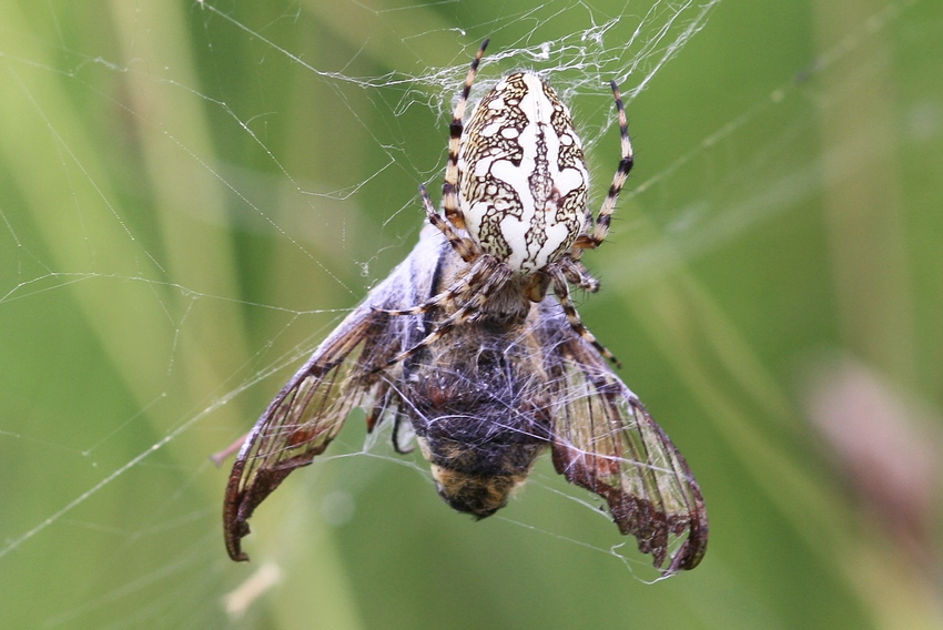 Hummelschwärmer als Opfer einer Eichblatt-Radnetzspinne (Aculepeira ceropegia) in Oberschwaben (Arlach), Juni 2014.