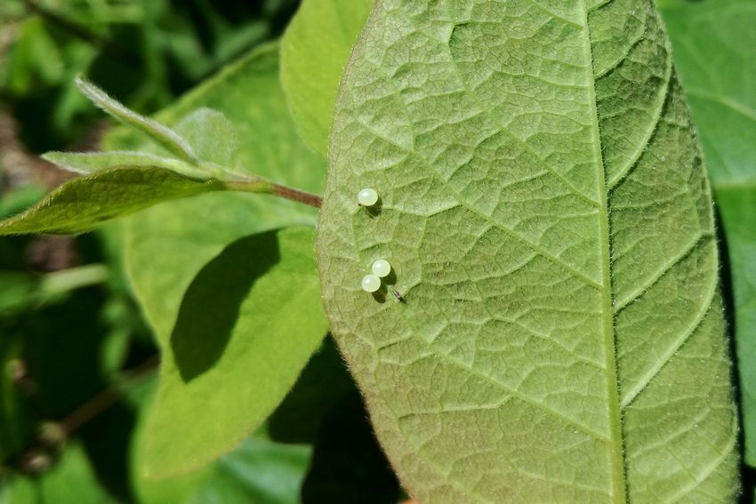 Eier von H. fuciformis an einer Roten Heckenkirsche im Schönbuch (NSG Schaichtal), Mai 2018.