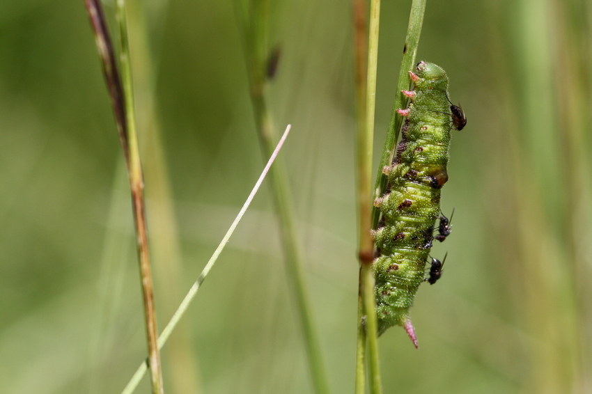 Parasitierte Larve des Skabiosenschwärmers in einem Magergrünland auf der Schwäbischen Alb (Undingen), Juli 2021.