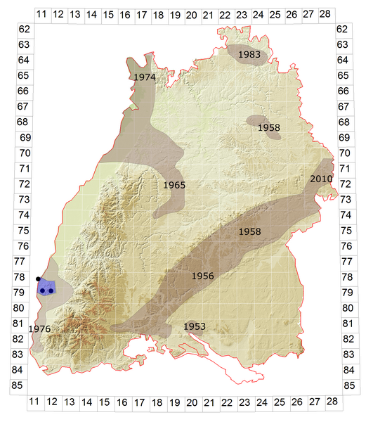 Grauer Bereich: Ehemalige Vorkommen (letztes Nachweisdatum)