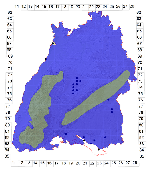 Schematische Verbreitung von H. arborea in Baden-Württemberg: