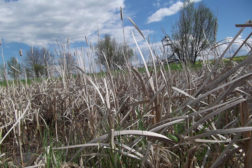 Laubfrosch-Gewässer im Albvorland (Unterjesingen), ebenfalls mit Rohrkolben bestandener, gut besonnter und fischfreier Teich.