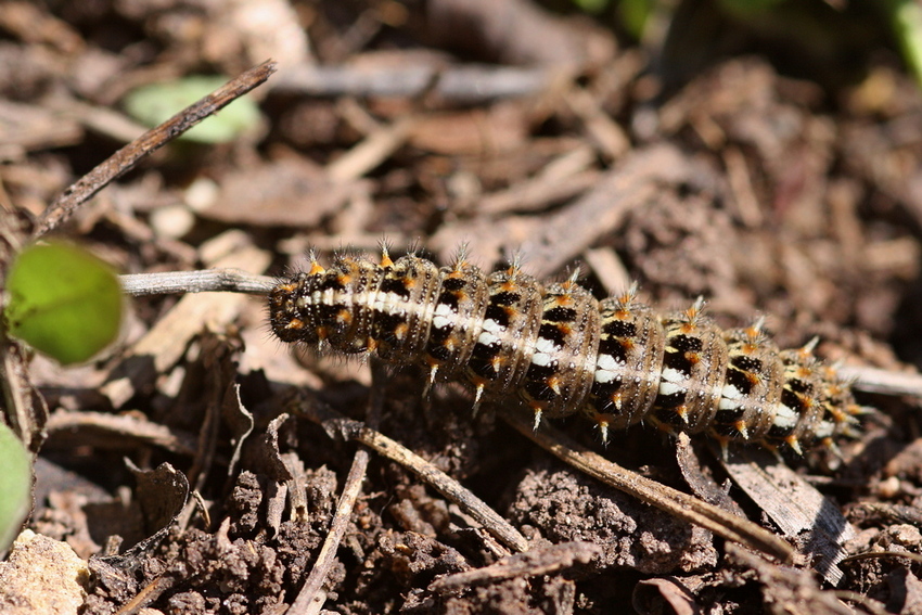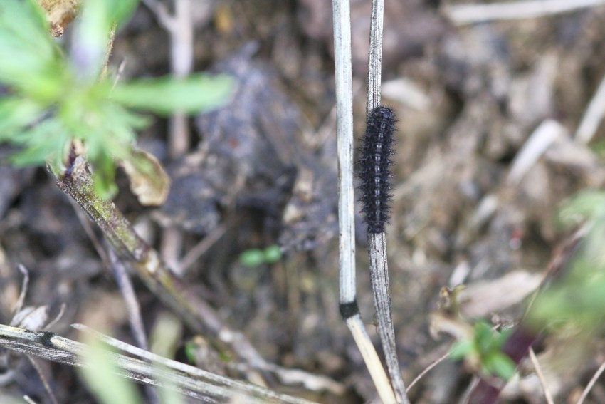 Sich sonnende, ausgewachsene Raupe des Kleinen Perlmutterfalters im Albvorland (NSG Hirschauer Berg), März 2021.