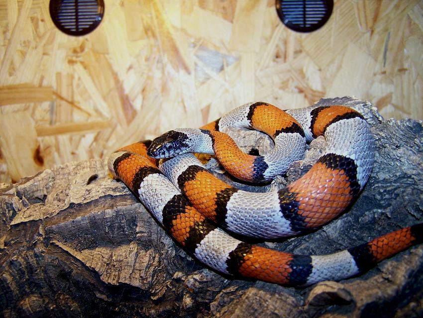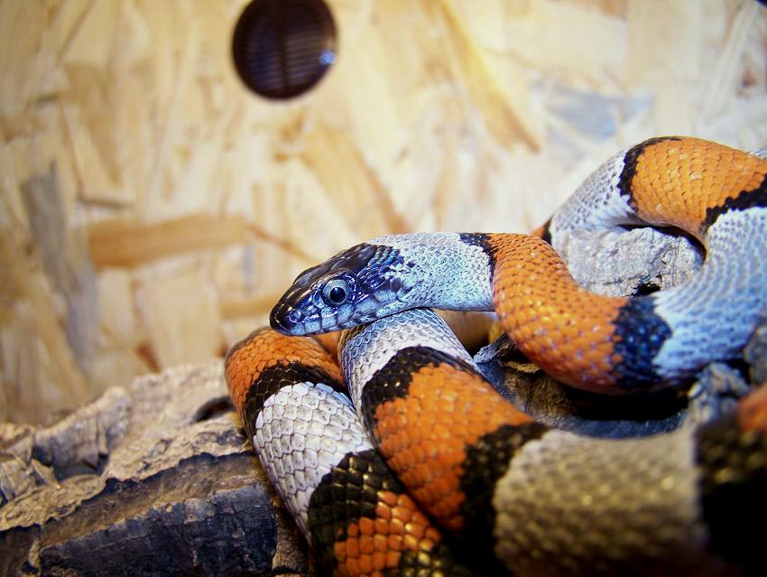 Ich erstand meine Zuchtgruppe im Februar 2006. Es handelte sich um ein Männchen von ungefähr 70 cm Länge und zwei Weibchen von 80-90 cm Länge aus dem Jahr 2003. Die Tiere lebten zusammen in einem Terrarium mit den Maßen 100x60x50 cm. Es war als Trockenterrarium mit Korkröhren und Steinen eingerichtet, dazu kamen noch eine Sukkulente und ein Wassergefäß. Beleuchtet wurde das Terrarium mit einer Leuchtstoffröhre und einem Spotstrahler, der für die nötigen Temperaturen zwischen 25 und 30° C sorgte. Ich fütterte jede Woche mit ein bis zwei Mäusen pro Tier. Jedoch waren die Schlangen sehr gierig und könnten durchaus noch mehr fressen, weshalb sie getrennt gefüttert werden mussten, da sie sich sonst ineinander verbissen hätten.