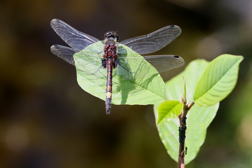Aufsicht auf ein sich sonnendes Männchen der Großen Moosjungfer in Oberschwaben (Untermooweiler), Juli 2013.