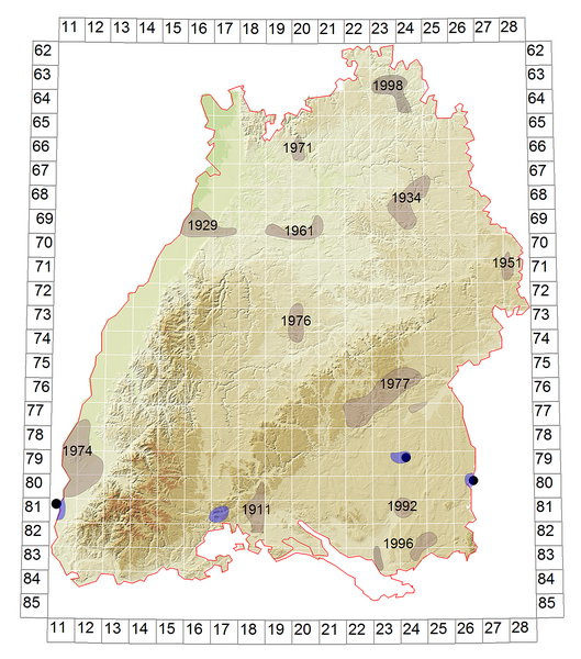 Grauer Bereich: Ehemalige Vorkommen (letztes Nachweisdatum)