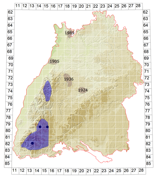 Grauer Bereich: Ehemalige Vorkommen (letztes Nachweisdatum)