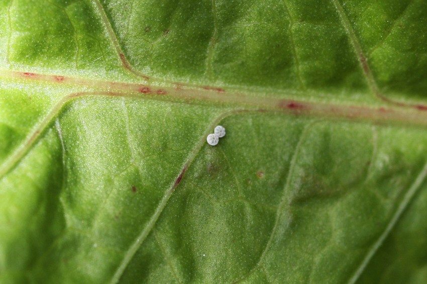Eigelege des Großen Feuerfaltes auf R. obtusifolius im Neckarbecken (Winnenden), August 2012.