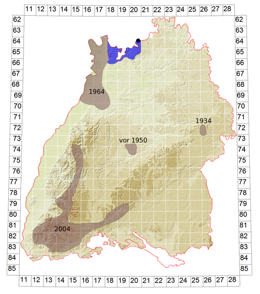 Schematische Verbreitung von L. virgaureae in Baden-Württemberg: