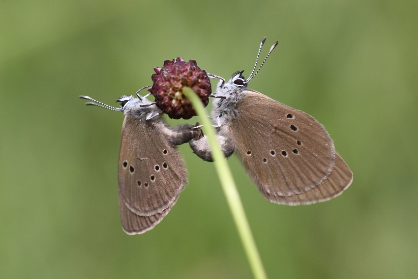 Der Helle Wiesenknopf-Ameisenbläuling (Phengaris teleius) ist noch gefährdeter als vorige Art und in Baden-Württemberg vom Aussterben bedroht.