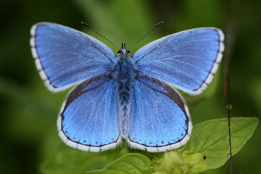 Der Himmelblaue Bläuling (Lysandra bellargus), hier das Männchen, ist auf Magerrasen noch regelmäßig anzutreffen.