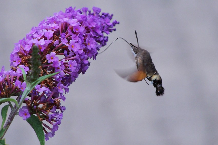 Taubenschwänzchen (Macroglossum stellatarum) an Flieder saugend im Albvorland (Tübingen), Juli 2007.