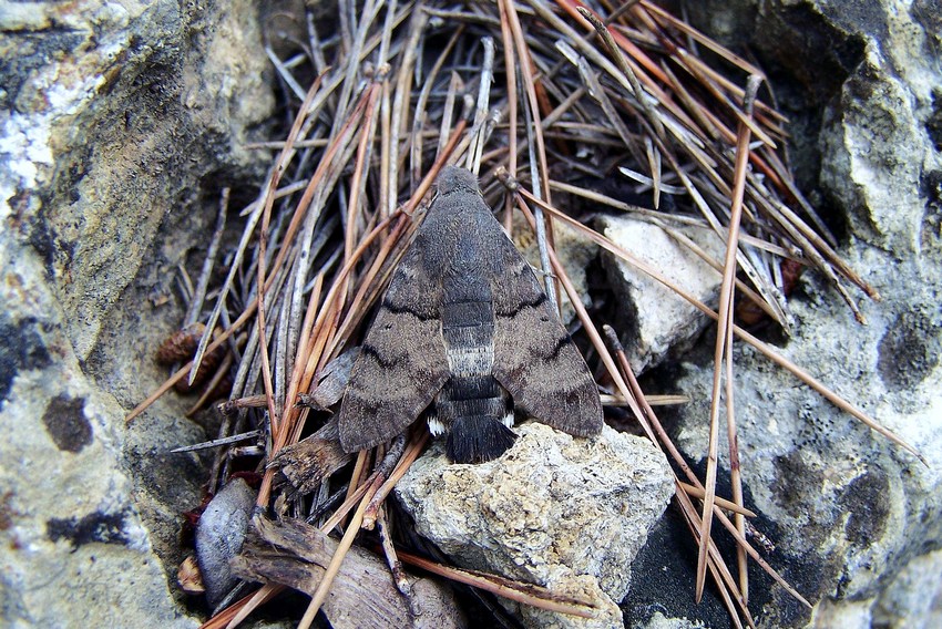 Ruhendes Taubenschwänzchen an einer Felswand in Südfrankreich, August 2007.