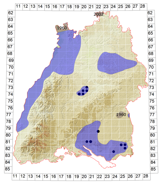 Grauer Bereich: Ehemalige Vorkommen (letztes Nachweisdatum)