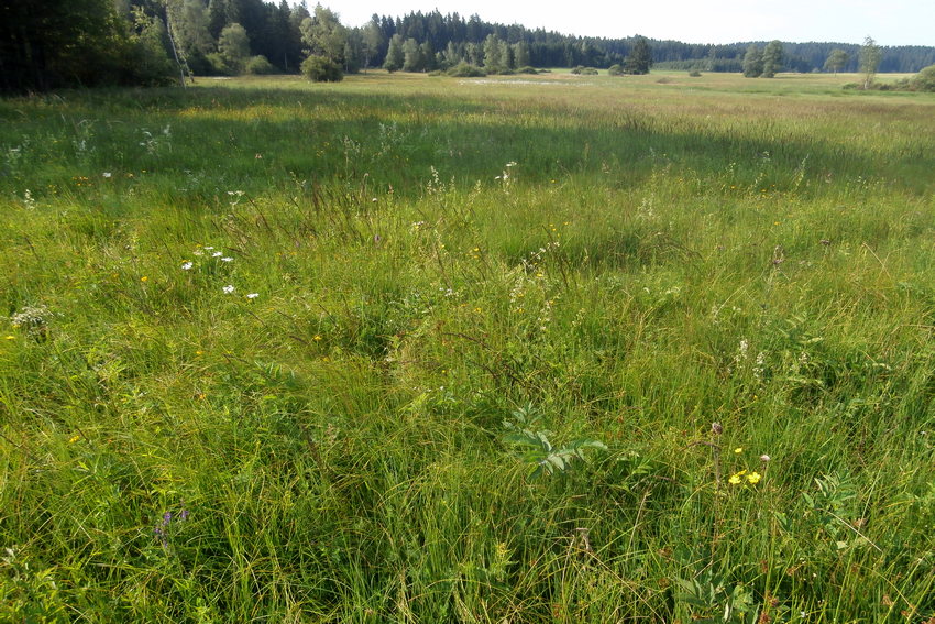 Habitat von P. teleius im württembergischen Allgäu (NSG Sigrazhofer Ried); großflächige Streuwiesen mit guten Beständen des Großen Wiesenknopfs.