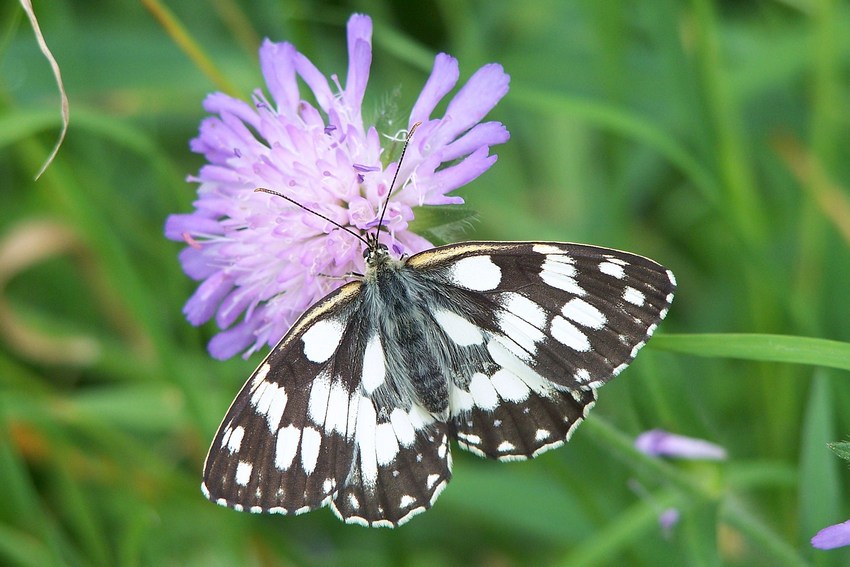 Schachbrettfalter (Melanargia galathea) auf einer südexponierten Magerwiese im Albvorland (Aichtal-Neuenhaus), Juni 2008.