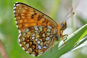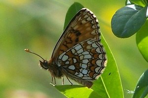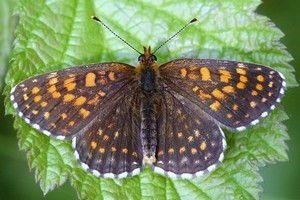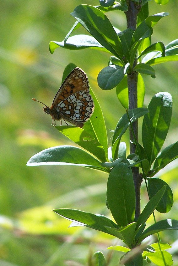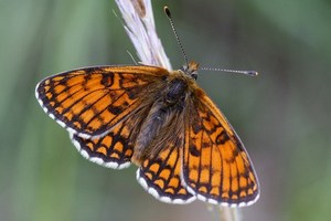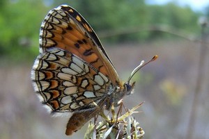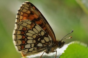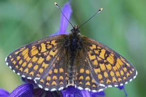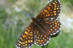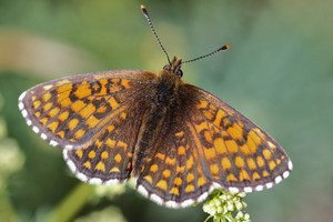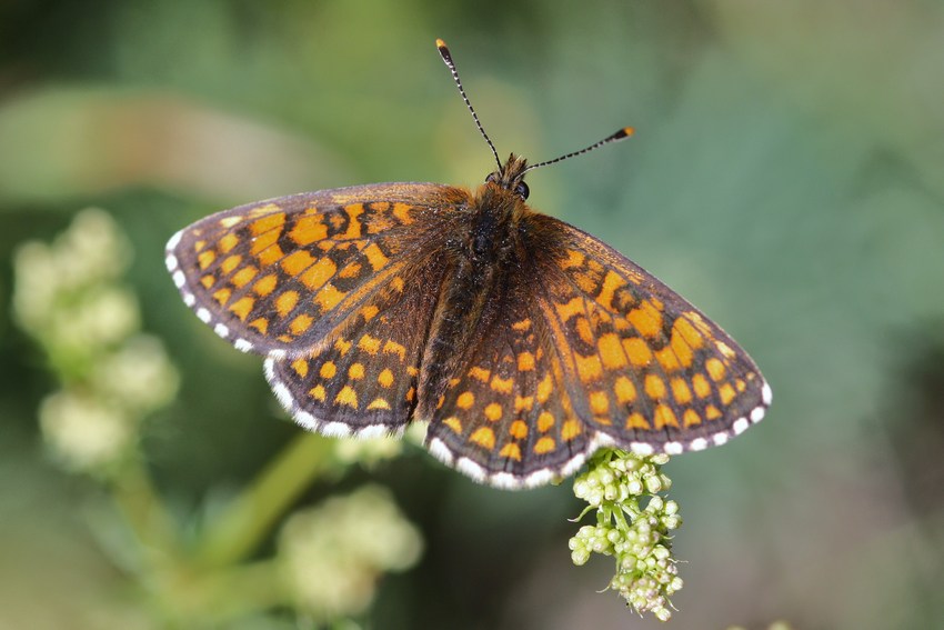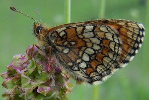 Ruhender Östlicher Scheckenfalter am südlichen Albtrauf (Untermarchtal), gut zu erkennen ist die charakteristische dunkle Binde, Juni 2014.