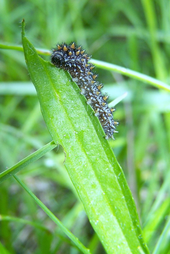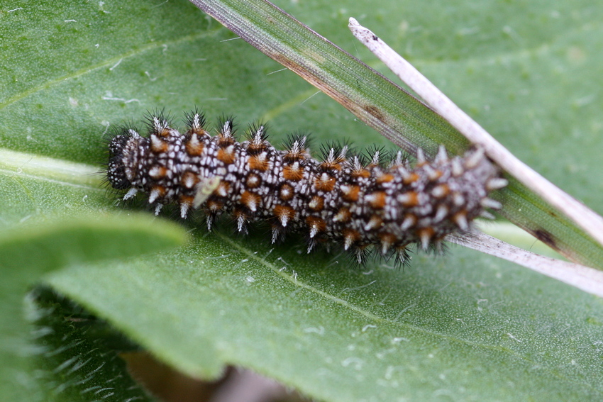 Raupe einer Melitaea-Art, wahrscheinlich von M. britomartis auf der Schwäbischen Alb (Meidelstetten), Juni 2010.