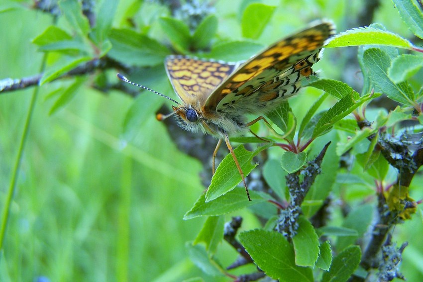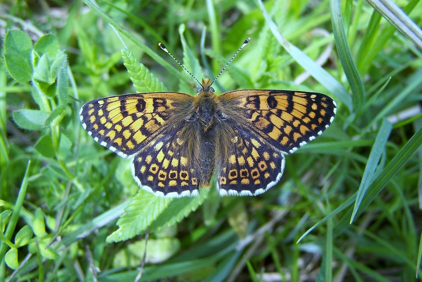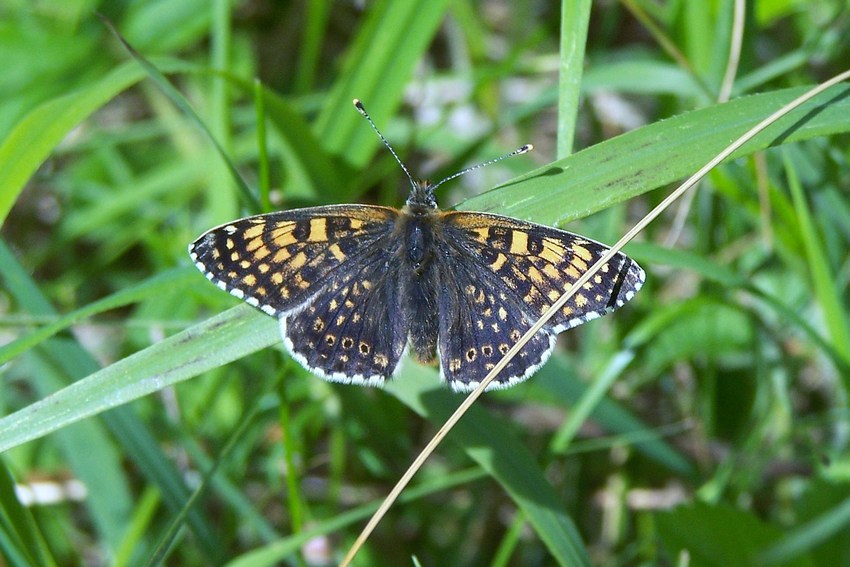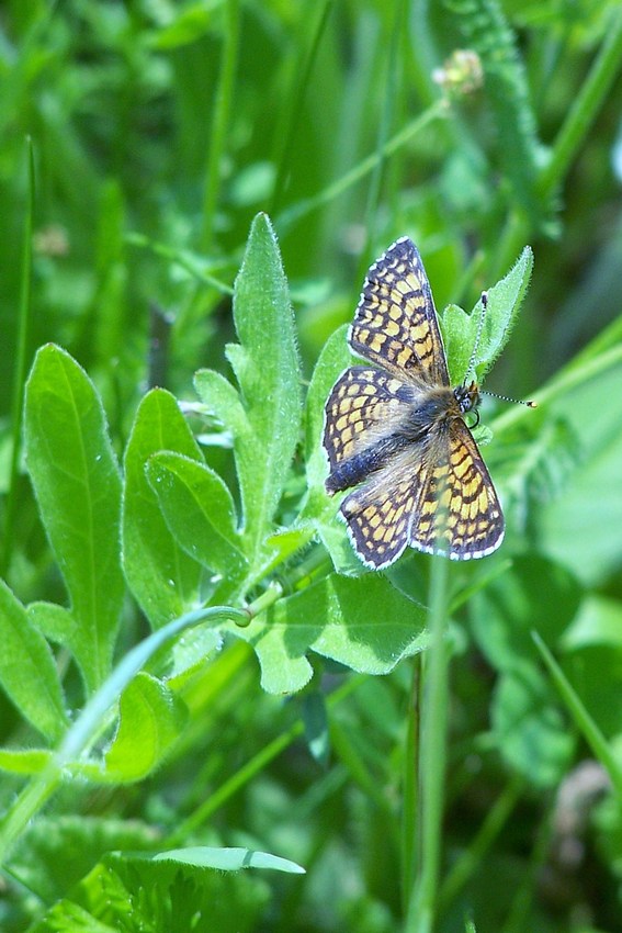 Flügelunterseite mit charakteristischer Fleckung von M. cinxia auf einer Magerbrache im Albvorland (Weil im Schönbuch), Mai 2011.